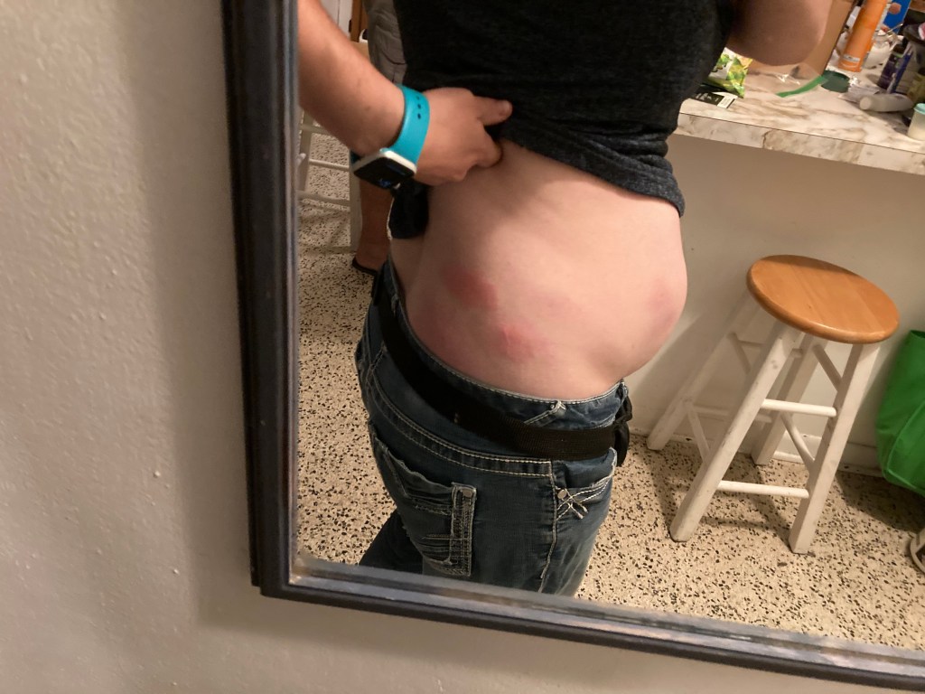 We’re still working on getting the Zofran pump dose dialed in so that I’m not losing my meals. I’m having irritation all over. At every site that the needles have transferred medication, I have red, raised, painful welts. I don’t have that much of a baby bump at only 17 weeks, but I’m already finding creative ways to avoid bending because of these angry, swollen spots all over my abdomen.